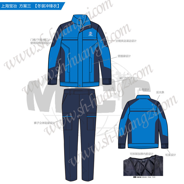 上海工作服設計定制(上海寶冶冬裝沖鋒衣):采用沖鋒衣面料,門襟/下擺/袖口/使用雙線加固設計;分割夾邊滾邊設計,上衣口袋采用:豎插袋設計,袖口加松緊設計,上衣后背:放光條設計;褲子2側口袋采用立體袋設計;內(nèi)膽:絲綿內(nèi)膽并可脫卸款式;