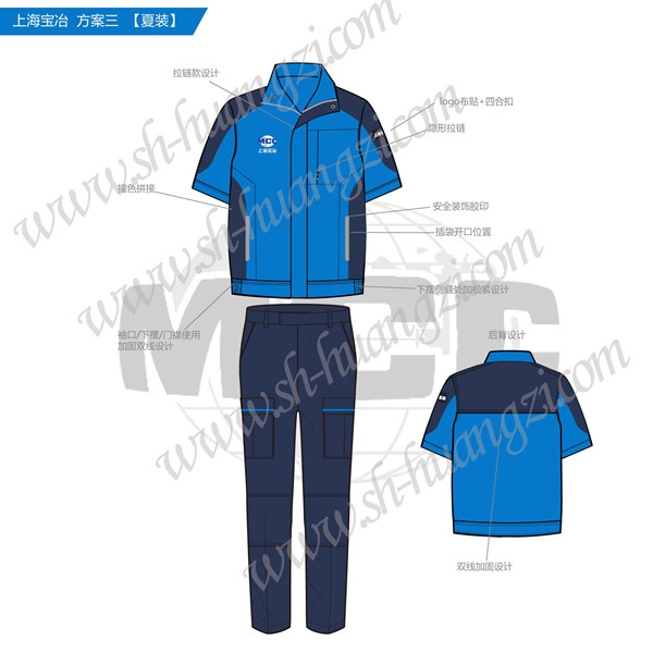 上海工作服設計定制(上海寶冶夏裝)面料采用:滌棉細斜紋的,上衣采用拉鏈款,撞色拼接設計,左側手臂:logo布貼+四合扣,隱形拉鏈設計,上衣口袋:安全裝飾膠印,下擺/門襟/袖口采用雙線加固設計,2側下擺和袖口加松緊設計。